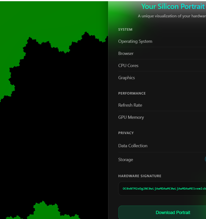 The system samples coarse, non-identifying hardware signals (such as timing variance, screen geometry, and available execution paths) and maps them deterministically into a visual field. The result is a portrait that is stable for a given machine, yet distinct across devices.